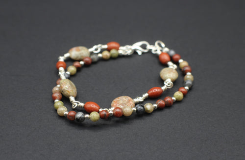 A stunning handcrafted bracelet featuring two complementary strands that create beautiful dimension and texture. One beaded strand showcases natural gemstone beads, including warm red jasper, earthy sesame jasper, and mystical labradorite. The second strand features larger beads chained with wire-wrapped links made from silver-plated copper wire, adding artisan detail and a touch of shine.